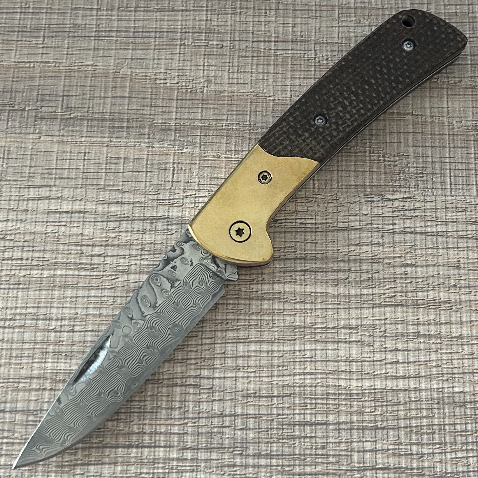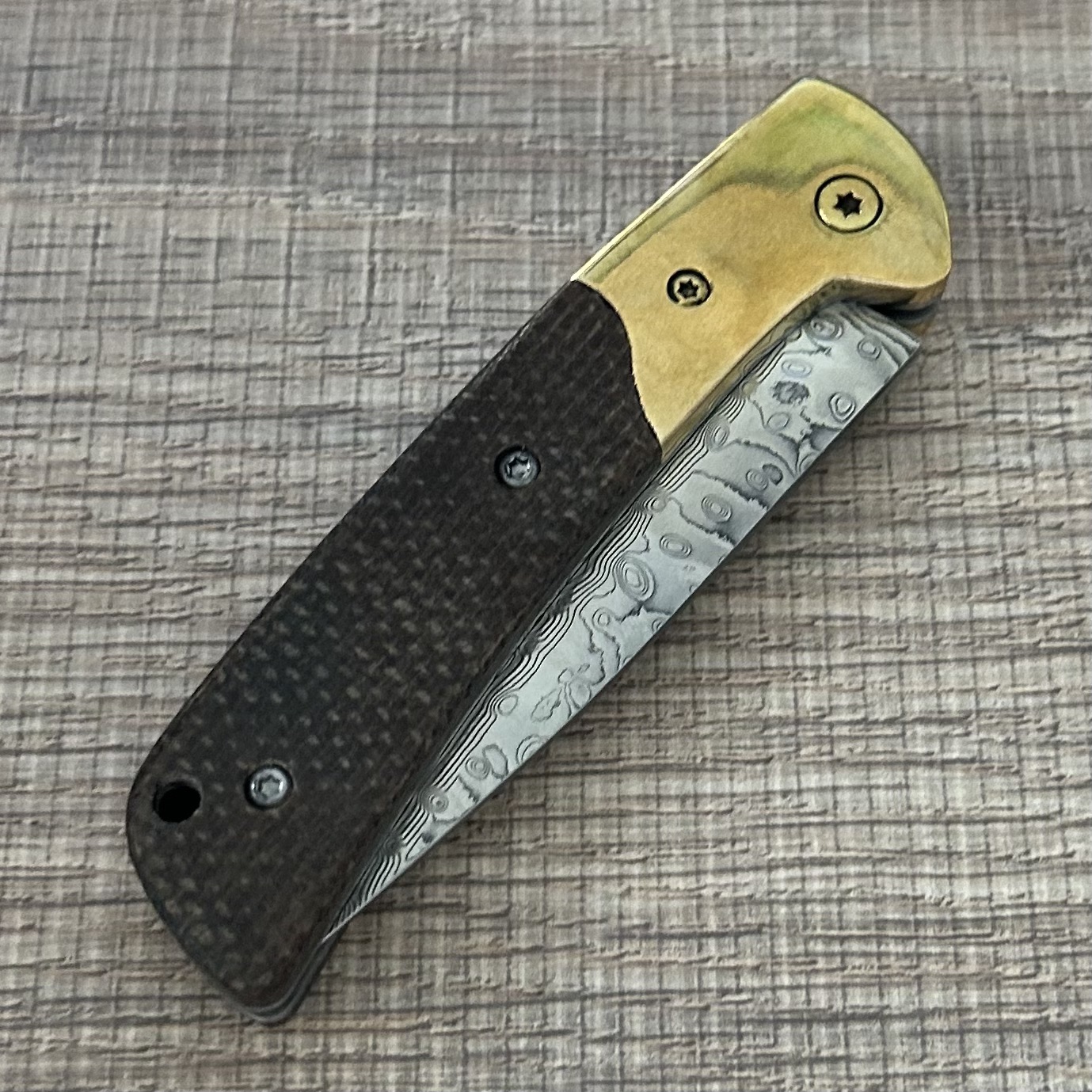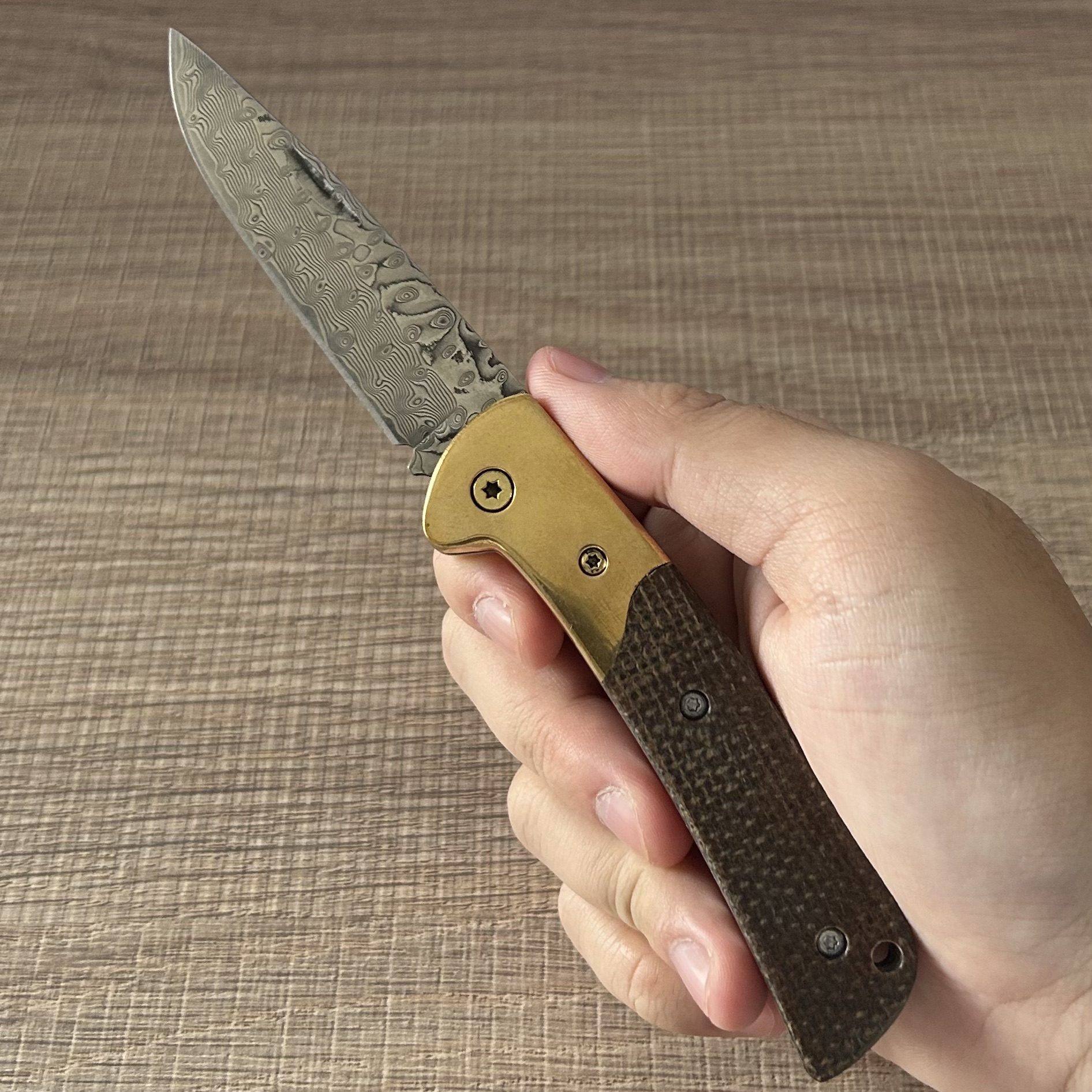 Home Shop wholesale Damascus EDC Knife – Brass-Trimmed Textured Grip The Sharp Art of Daily Carry